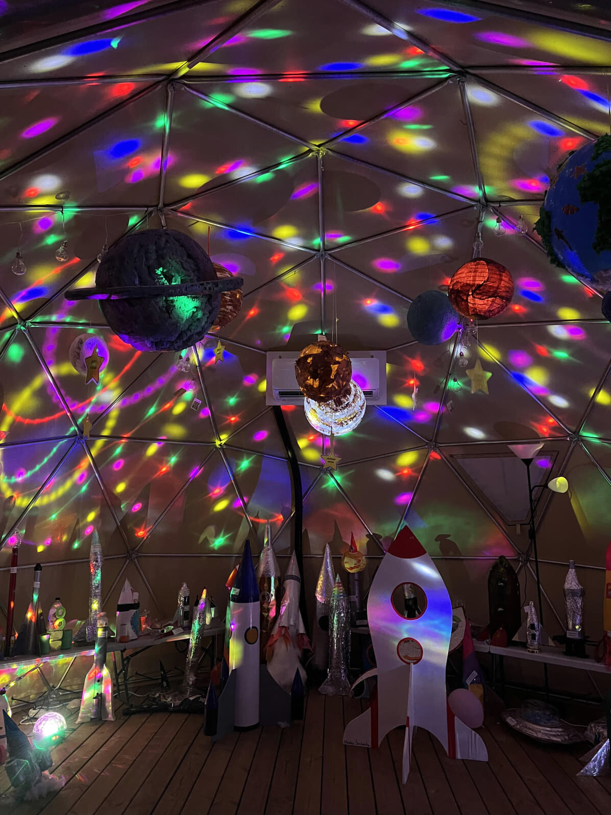 Darželio kieme stovintis kupolas net tris savaites virto tikra mažąja visata. Jo viduje vyko kosminių skraidymo objektų ir dangaus kūnų paroda, kurią kūrė vaikai kartu su šeimomis ir mokytojomis. Kupolas buvo apšviestas šviečiančiomis, mirgančiomis girliandomis, todėl atrodė, lyg žvaigždės būtų nusileidusios visai arti. Parodoje buvo galima pamatyti pačių įvairiausių kosminių skraidymo objektų – spalvingų raketų, skraidančių lėkščių ir fantastinių kosminių laivų. Kiekvienas darbelis buvo savitas, pagamintas su meile ir kantrybe. Kupolo viršuje spindėjo dangaus kūnai, kuriuos vaikai gamino su mokytojomis. Mirgančios švieselės, susižavėję žvilgsniai ir nuolatinis „pažiūrėk, koks gražus!“ kūrė jausmą, tarsi visi būtų trumpam iškeliavę į žvaigždžių pasaulį. Tai buvo paroda, kuri ne tik džiugino akis, bet ir kvietė svajoti, tyrinėti bei didžiuotis bendru kūrybiniu darbu.